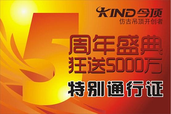 為慶祝今頂集成吊頂公司成立5周年,同時近期榮獲《行業(yè)推薦品牌》、《誠信品牌》等榮譽(yù)稱號,今頂廠家特推出“輝煌5周年,狂送5000萬”全國大型促銷活動。
