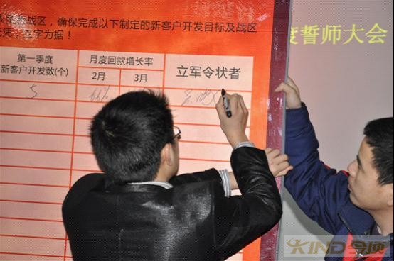 緊接著,在熱血沸騰的戰(zhàn)歌聲中,今頂全國(guó)戰(zhàn)區(qū)第一季度誓師大會(huì)拉開序幕。十大戰(zhàn)區(qū)參謀長(zhǎng)帶領(lǐng)各自戰(zhàn)區(qū)的作戰(zhàn)參謀,揮舞著戰(zhàn)旗,吶喊著口號(hào),氣勢(shì)磅礴地走向龍虎榜,寫上自己的第一季度銷售目標(biāo),簽下軍令狀,以此表決他們堅(jiān)定的態(tài)度和必勝的信心!