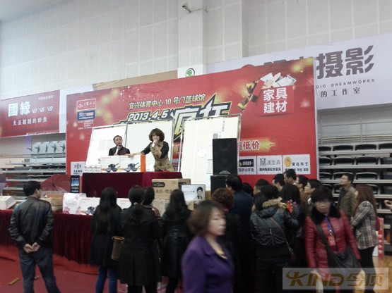 2013年4月5日由美凱龍愛家聯(lián)盟、宜興房產(chǎn)超市網(wǎng)、魅力團購網(wǎng)主辦,315消費者協(xié)會監(jiān)督的“大牌也瘋狂”家居建材砍價會在宜興體育中心舉行。宜興今頂攜手王者陶瓷、菲林格爾地板、至樂原木門、朗斯淋浴房、席碼整體衛(wèi)浴、勞卡衣柜、普樂美水槽、美國舒達床墊、藍谷智能廚房、澳美森澳洲海派實木家具、豪廷布藝同參加了本次活動。