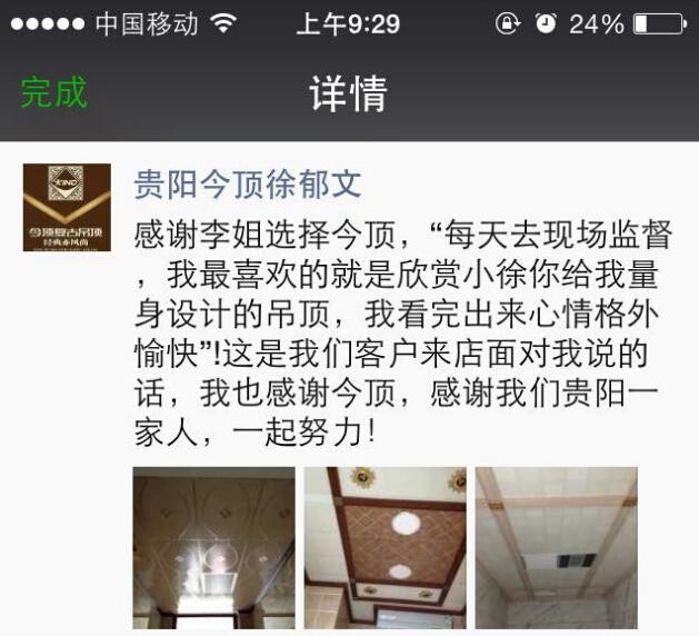 “每天去現(xiàn)場(chǎng)監(jiān)督,我最喜歡的就是欣賞小徐給我量身設(shè)計(jì)的吊頂,我看完出來心情格外愉快!”這是家住貴陽金陽會(huì)展城9號(hào)的李女士在朋友圈分享的微信原文。從微信內(nèi)容看得出,李女士對(duì)家里選用的吊頂十分滿意,并急于將這份愉快分享給自己身邊的朋友。究竟是什么樣的吊頂,讓李女士如此心花怒放呢?