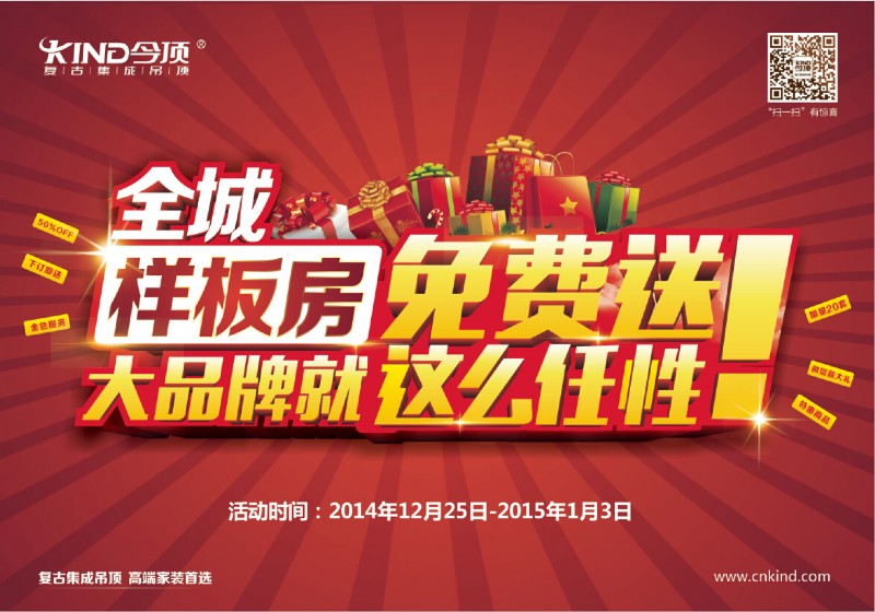 大品牌,敢任性!今頂復古集成吊頂將于2014年12月25日在全國范圍內(nèi)開啟“樣板房免費送”回饋計劃: