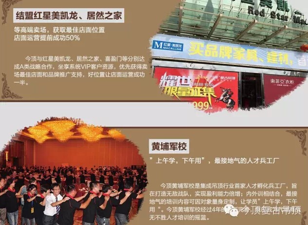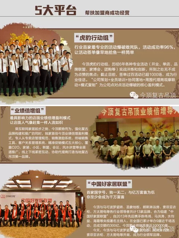 作為“吊頂行業(yè)協(xié)會副會長單位”、“行業(yè)國家標(biāo)準(zhǔn)起草單位”,復(fù)古吊頂開創(chuàng)者,嘉興市今頂電器科技有限公司歷經(jīng)9年的發(fā)展歷程,以不同,創(chuàng)造不凡的氣勢,鐫刻光輝與榮耀,引領(lǐng)著復(fù)古吊頂走向高端家裝市場。憑借“虎豹行動組”、“業(yè)績倍增組”、“中國好家居聯(lián)盟”、“紅星美凱龍/居然之家戰(zhàn)略合作”、“黃埔軍校特訓(xùn)營”等五大平臺,打造出貫穿店面選址、開業(yè)籌備、人員培訓(xùn)、門店運(yùn)營、活動爆破全程一體的加盟商扶持系統(tǒng)。
