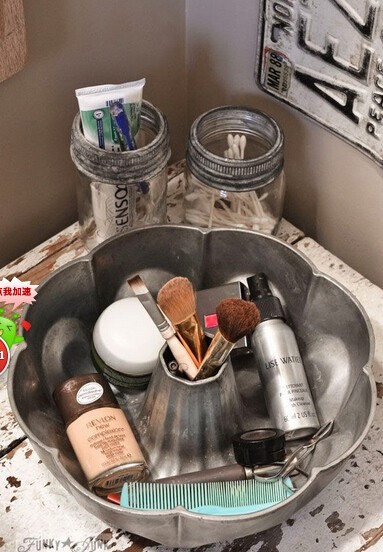 拿個漂亮的大盆把東西裝起來,省的本來就容易粘乎乎的瓶瓶罐罐再粘上一層灰然后粘在盥洗臺上