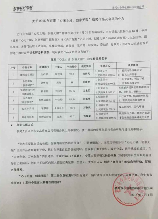 2015年首屆“心無止境,創(chuàng)意無限”征集案通過各部門努力已圓滿結(jié)束,為表彰提供優(yōu)秀創(chuàng)意并轉(zhuǎn)化為公司即戰(zhàn)力的員工,同時(shí)激勵(lì)全體員工在下一屆活動(dòng)中更加踴躍,進(jìn)一步加強(qiáng)企業(yè)創(chuàng)新文化建設(shè),廣開思路,激發(fā)潛能,鼓勵(lì)創(chuàng)新,降耗增效,培養(yǎng)優(yōu)秀人才,增強(qiáng)主人翁意識(shí)所舉辦。