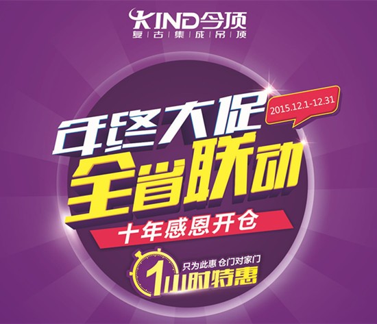 2015即將過去,今頂集成吊頂踏過輝煌的歷史,即將翻開嶄新的篇章!今年的最后一場活動(dòng),以今頂公司牽頭的全國性大型活動(dòng),圓夢2015,誓做最好的吊頂,及最大化優(yōu)惠給到業(yè)主! 10年來唯有的一次優(yōu)惠,史無前例的工廠讓利,感恩開倉,開倉放糧!