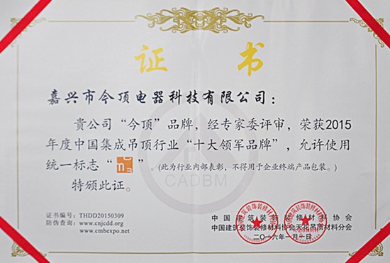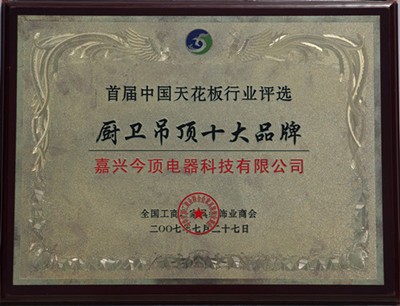2007年07月27日,今頂?shù)蹴敇s膺首屆全國工商聯(lián)家具裝飾業(yè)商會中國天花板行業(yè)委員會“廚衛(wèi)吊頂十大品牌”,同時入選全國工商聯(lián)家具裝飾業(yè)商會天花板專業(yè)委員會理事單位。