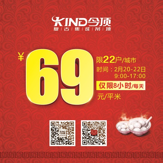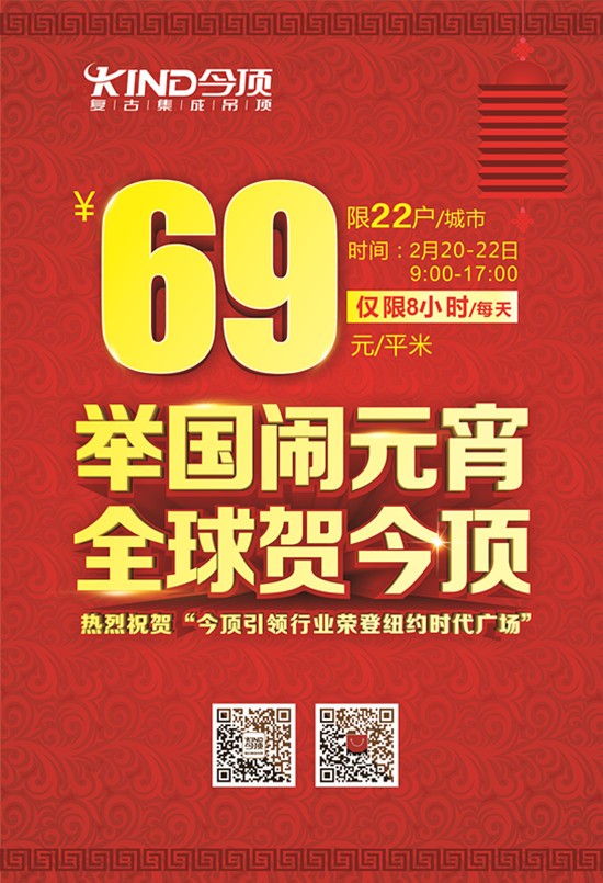 今頂集成吊頂在新春佳節(jié)、元宵佳節(jié)之際,為慶祝今頂榮登紐約時(shí)代廣場,今頂復(fù)古集成吊頂全國1000多家專賣店將同期開展“舉國鬧元宵,全球賀今頂”促銷活動(dòng),以多重好禮回饋老客戶!讓我們一起迎接嶄新的2016,共享元宵的優(yōu)惠盛宴!