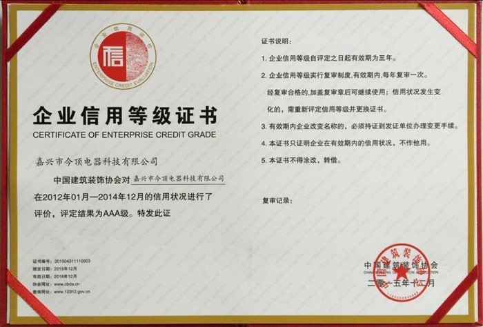近日中國建筑裝飾協(xié)會對嘉興市今頂電器科技有限公司的信用狀況進行了專業(yè)化考評,今頂憑借優(yōu)異的經(jīng)營管理能力、財務(wù)實力以及良好的社會誠信,評定結(jié)果為AAA級。此次榮獲“AAA級信用企業(yè)”稱號更是讓今頂備感殊榮!