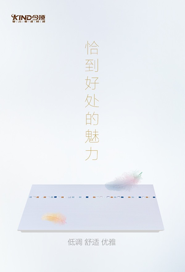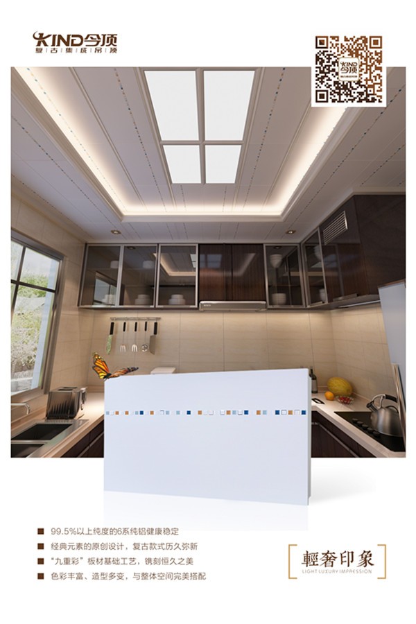 本次“輕奢印象”系列是2016年今頂集成吊頂春季新品“尊雅系列”持續(xù)性延伸產(chǎn)品。依舊采用今頂集成吊頂獨特氧化及絲印工藝,抗紫外線、色彩均勻一致、紋理清晰逼真、不褪色,健康環(huán)保!獨具特色的是將板材拉長,300*485全新出擊,打破集成吊頂傳統(tǒng)板材方正理念,讓家的天空拼接有更多的選擇,讓消費(fèi)者成為藝術(shù)的創(chuàng)造者。同時,本系列簡約時尚輕奢華,配以花紋點綴,真實肌理紋路突顯文化沉淀,在光的瞬息萬變中揭示著自然界的奧妙,給人一種自然簡約又復(fù)古的基調(diào)。
