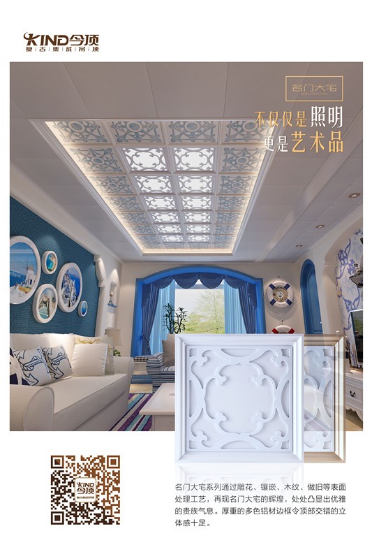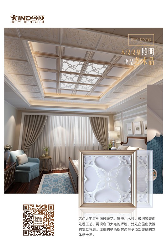 今頂集成吊頂“名門大宅”系列集成吊頂春季新品奢華上市,板材和LED照明兩種系列帶來(lái)最完美的組合。本次“名門大宅”系列產(chǎn)品依舊以整體設(shè)計(jì)效果為基調(diào),力求把中華傳統(tǒng)元素與窗花藝術(shù)相融合,創(chuàng)造出中華文化特色的名門大宅風(fēng)格。通過(guò)不同風(fēng)格的板材和LED照明巧妙結(jié)合,板材的大氣奢華,燈光的變幻莫測(cè),帶來(lái)視覺(jué)上的極致體驗(yàn),整體風(fēng)格經(jīng)典、奢華、又不失雅致?!懊T大宅”系列不僅是承載一個(gè)大家庭生活的空間,其蘊(yùn)含人文、內(nèi)藏禮序與尊榮的底蘊(yùn),也是繼續(xù)延承下去的珍貴財(cái)富。