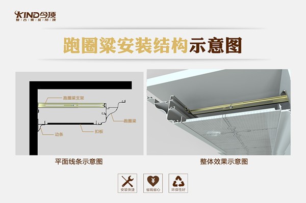 今頂集成吊頂跑圈梁,集集成吊頂所有優(yōu)點(diǎn)于一身,不用膠,不開裂,不發(fā)霉。今頂2016最新板材環(huán)保性能好,讓家的生活更綠色更舒心更安全!利用今頂獨(dú)創(chuàng)的跑圈梁支架配合跑圈梁、邊條、扣板,實現(xiàn)快速安裝,省錢又省心,讓家的天空又增添了一份溫馨。