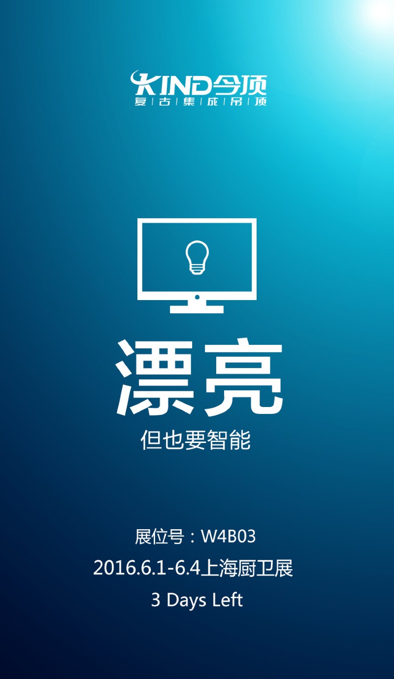 當(dāng)人類的智慧和行動(dòng)能力發(fā)展成為智能的時(shí)候,集成吊頂?shù)闹悄懿椒ピ谌祟惖膸ьI(lǐng)下逐漸向我們走來(lái)。2016年第21屆中國(guó)(上海)國(guó)際廚房、衛(wèi)浴設(shè)施展覽會(huì),今頂集成吊頂即將在W4B03展位呈現(xiàn)最聰明、最新潮的產(chǎn)品。