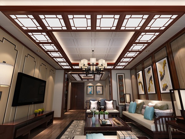 莊重與優(yōu)雅雙重氣質(zhì),紅檀色系一體錯層圍繞客廳,造型對稱色彩講究,中式窗格LED組合充滿了古樸的韻味和深厚的文化內(nèi)涵。