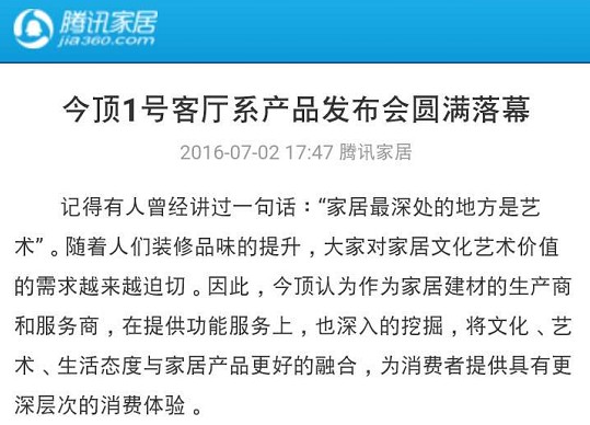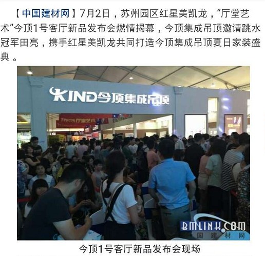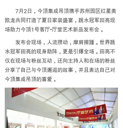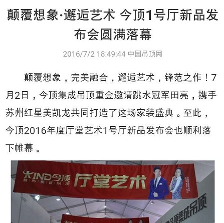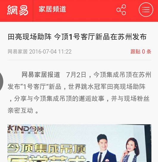 7月2日今頂攜手跳水冠軍田亮廳堂藝術(shù)暨1號客廳新品發(fā)布會活動霸占了集成吊頂行業(yè)媒體的頭條,影響力不僅僅體現(xiàn)在行業(yè)內(nèi),這場發(fā)布會也吸引著行業(yè)外家居類主流媒體的密切關(guān)注。