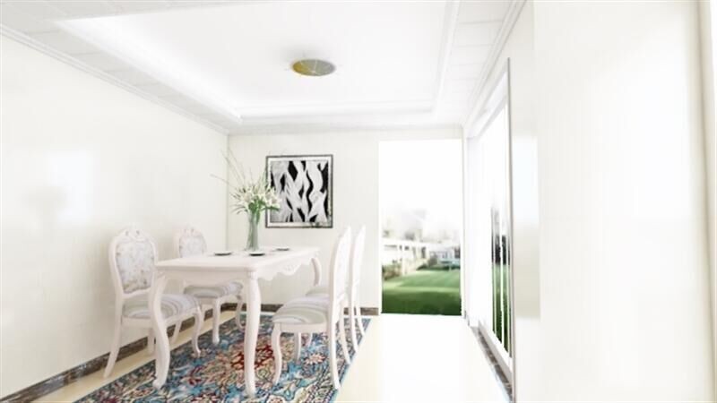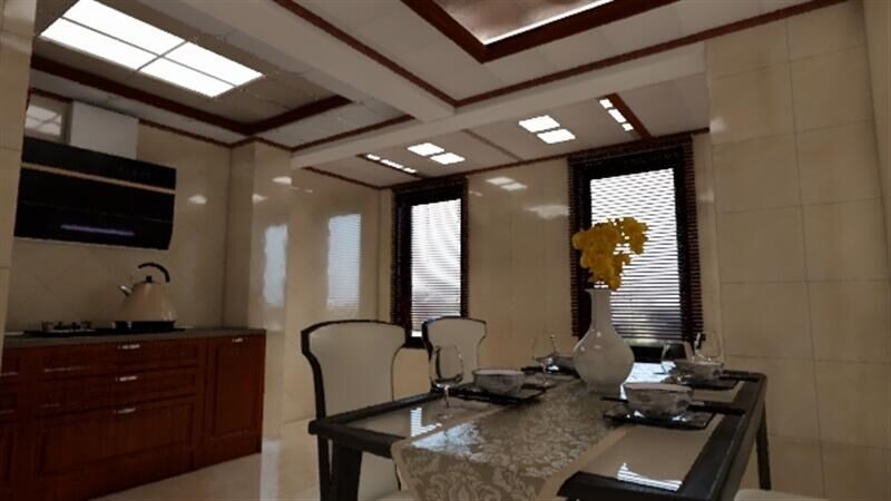 家人的和睦,配上今頂?shù)闹惺降蹴敚谝患胰藞F團圓圓、闔家歡樂、共進美食的餐廳里,氣氛異常歡快。所以,餐廳吊頂采用的是古韻板材和木色邊條相互搭配,中間并做往里凹的處理,加以中式吊頂使得凹凸有致,層次更加分明,一系列的結(jié)合象征著一家老小團圓幸福,意義深重。餐桌也是采用了現(xiàn)代款深色方形臺面,與頂部互相輝映。