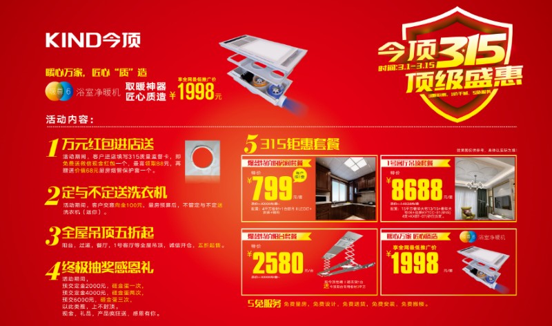 萬元紅包進店送:活動期間,客戶進店填寫315質量監(jiān)督卡,即免費送微信現(xiàn)金紅包一個,最高領取88元,再贈送價值68元廚房煙管保護套一個。