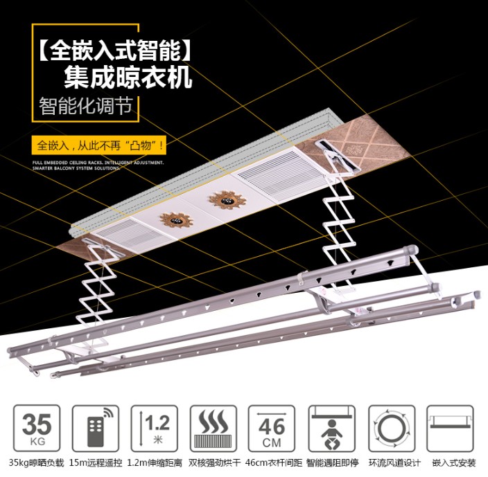 以今頂智能晾衣機(jī)為例,擁有智能遙控功能,15m遠(yuǎn)程遙控,1.2m自動升降,老人、小孩、孕婦均可輕松自如晾曬衣物,不會因為高舉晾衣叉往頂部或外面晾衣服而發(fā)生意外。
