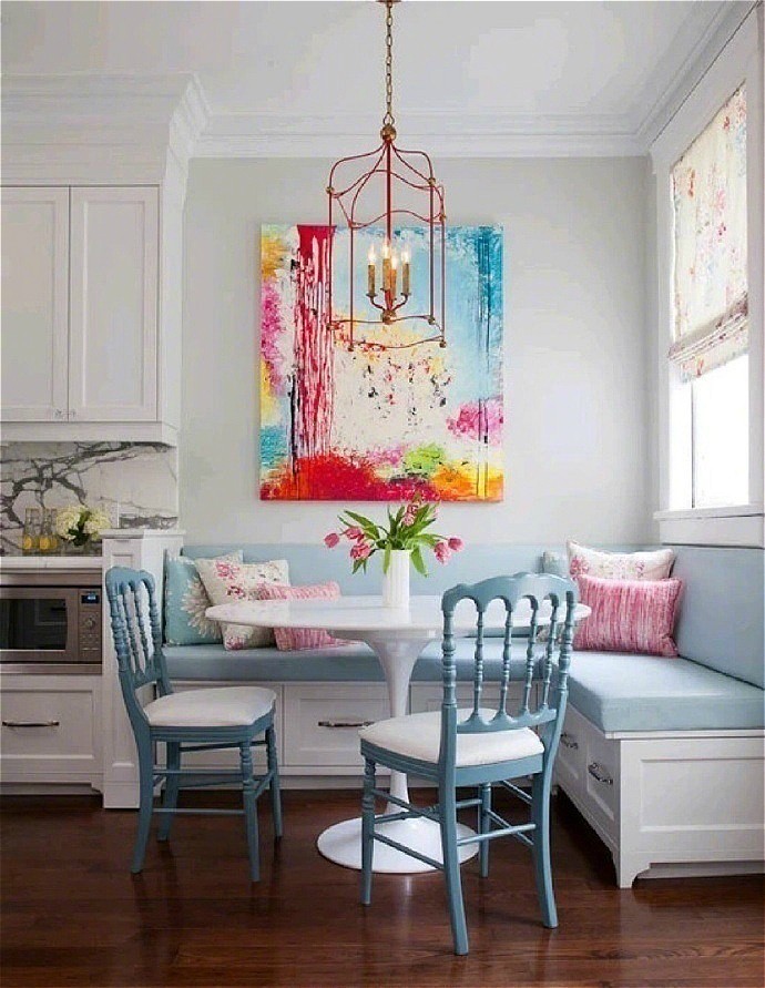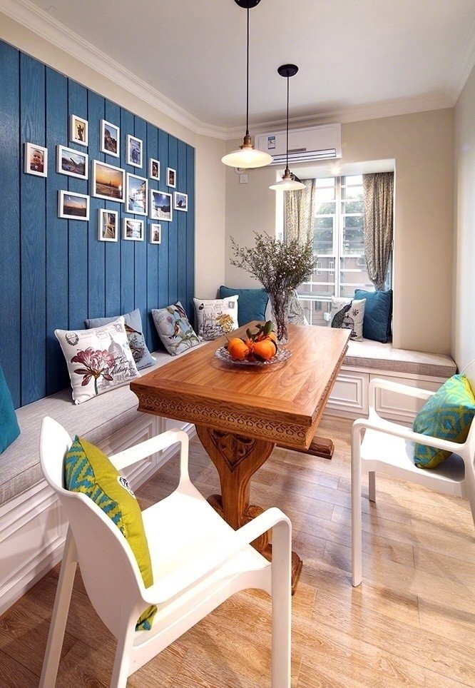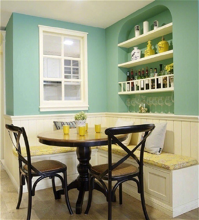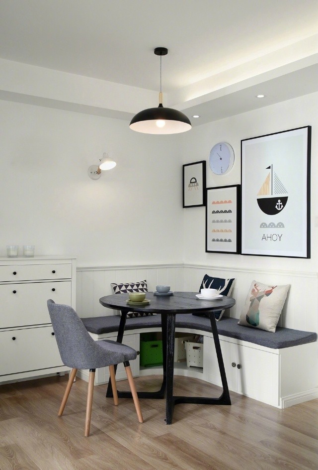 卡座餐廳多半是靠墻設(shè)計(jì),或者干脆是在屋子一角,省去了一至兩側(cè)餐椅背后的過(guò)道,大大縮小了餐桌椅所占的整體空間。