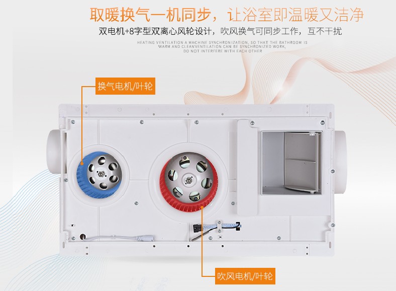 雙電機(jī)+8字型雙離心風(fēng)輪的設(shè)計(jì),可保證吹風(fēng)換氣同步運(yùn)行,讓浴室暖而不悶。