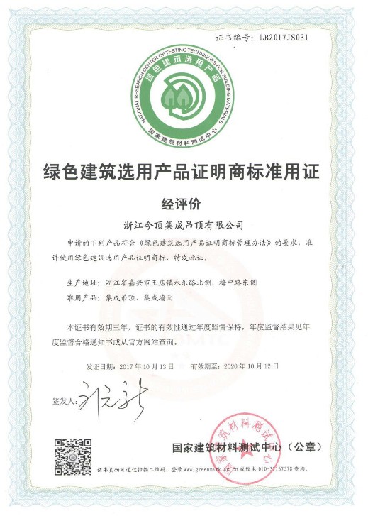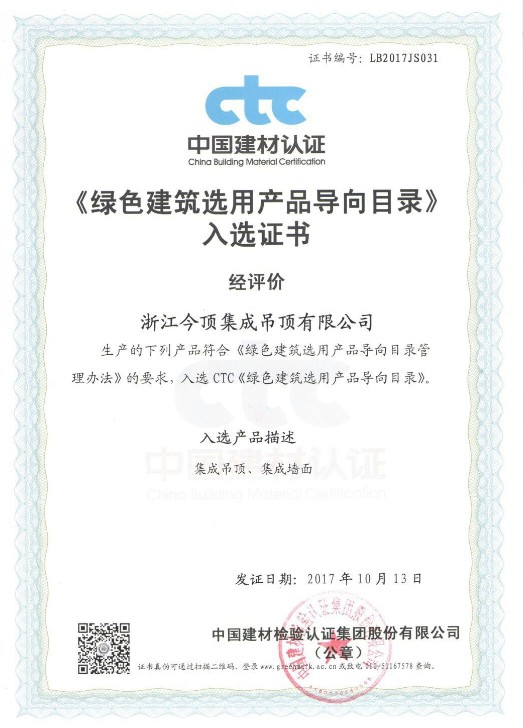 一直以來,今頂集成吊頂堅持高端產(chǎn)品定位,產(chǎn)品質量通過了ISO9001-2008國際管理體系認證,并多次獲得國家或省部級認證、推廣的健康、安全、節(jié)能、環(huán)保類證書,入選了【綠色建筑選用產(chǎn)品導向目錄】及準許使用【綠色建筑選用產(chǎn)品證明商標】,綠色環(huán)保、優(yōu)質安全的形象深入人心——