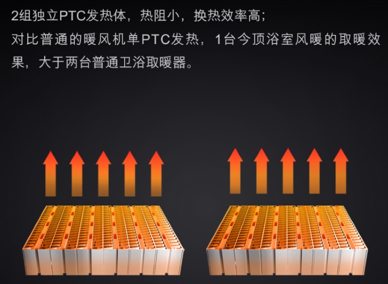 2、兩組獨(dú)立PTC發(fā)熱體:熱阻小,換熱效率高,雙倍發(fā)熱效果,使快速暖房變得輕而易舉!