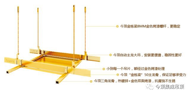 今頂金棟梁從背板、龍骨到掛件每一顆鋼拴、每一片吊件都經(jīng)過(guò)了熱鍍鋅和金色烤漆處理,抗腐蝕性強(qiáng),不生銹、不生斑,實(shí)現(xiàn)恒久穩(wěn)定。50MM寬度主龍骨保證足夠承受力,更具平衡穩(wěn)定性,超長(zhǎng)的3米龍骨,避免接縫出現(xiàn)的不平整和接口易生銹等現(xiàn)象。