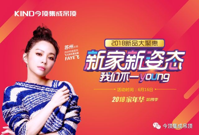 F.I.R飛兒樂團(tuán)原主唱faye飛,6月16日空降蘇州紅星美凱龍?zhí)K州園區(qū)商場(chǎng),助陣今頂集成吊頂2018家年華第四季“新家新姿態(tài),我們不一young”!率先體驗(yàn)今頂2018春季新品,暢享超低折扣聚惠!