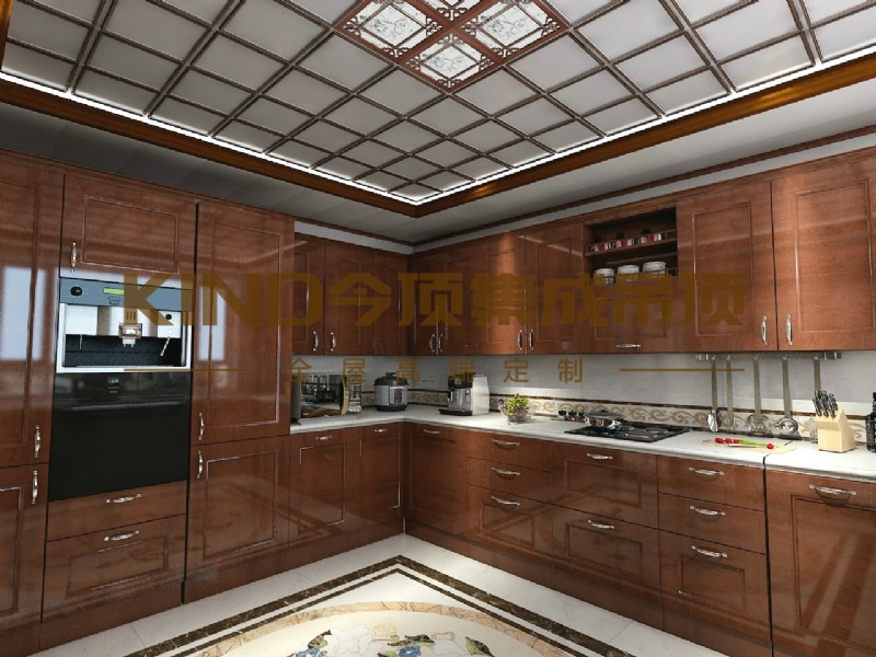 一走進(jìn)廚房,首先奪去人眼球的就是一整面鮮亮的棕色整體櫥柜,為了平衡這大片的櫥柜色彩,吊頂選擇了白底細(xì)邊的“天圓地方”,搭配“憶江南”LED造型燈,又利用微錯(cuò)層設(shè)計(jì)加深了層高效果,有效減少了櫥柜的壓抑感,整體風(fēng)格舉重若輕,頗有大將之風(fēng)。