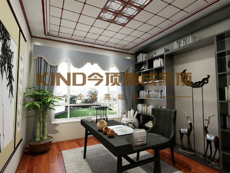 真要說(shuō)起來(lái),書(shū)房絕對(duì)是最適合中式風(fēng)格的居室空間,墻上掛一兩幅字畫(huà),墻角設(shè)一株綠植,桌邊擺一套筆墨紙硯,背后是一整墻的書(shū)籍,頭頂是棋盤(pán)造型的“踏雪尋芳”,何等書(shū)香,何等愜意?