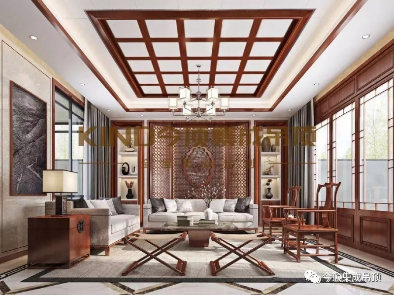 對(duì)于居室“門面擔(dān)當(dāng)”的客廳來說,一款大方雅致的吊頂是可以直接奠定整個(gè)客廳的風(fēng)格基調(diào)的。以今頂歸瀾系列中的“古韻今生”為例,白底+棕木色邊框的造型簡約大方,不需要多么繁復(fù)的花紋,就能輕松勾勒出新中式風(fēng)格的靈魂,搭配同色系的桌椅家具,鋪上舒適的淺色地毯,再設(shè)一面鏤空屏風(fēng),一間雅致又不失新穎,舒適又不失品味的新中式客廳就輕輕松松地誕生啦!