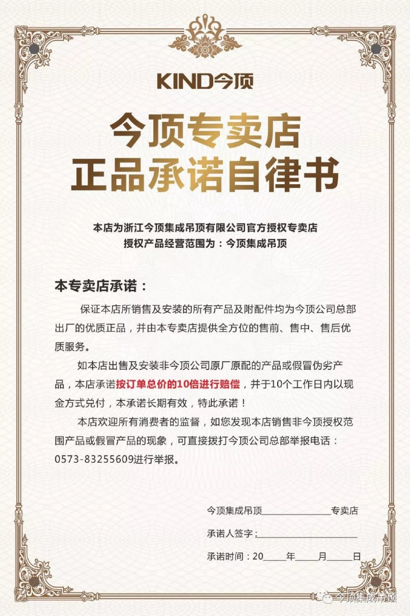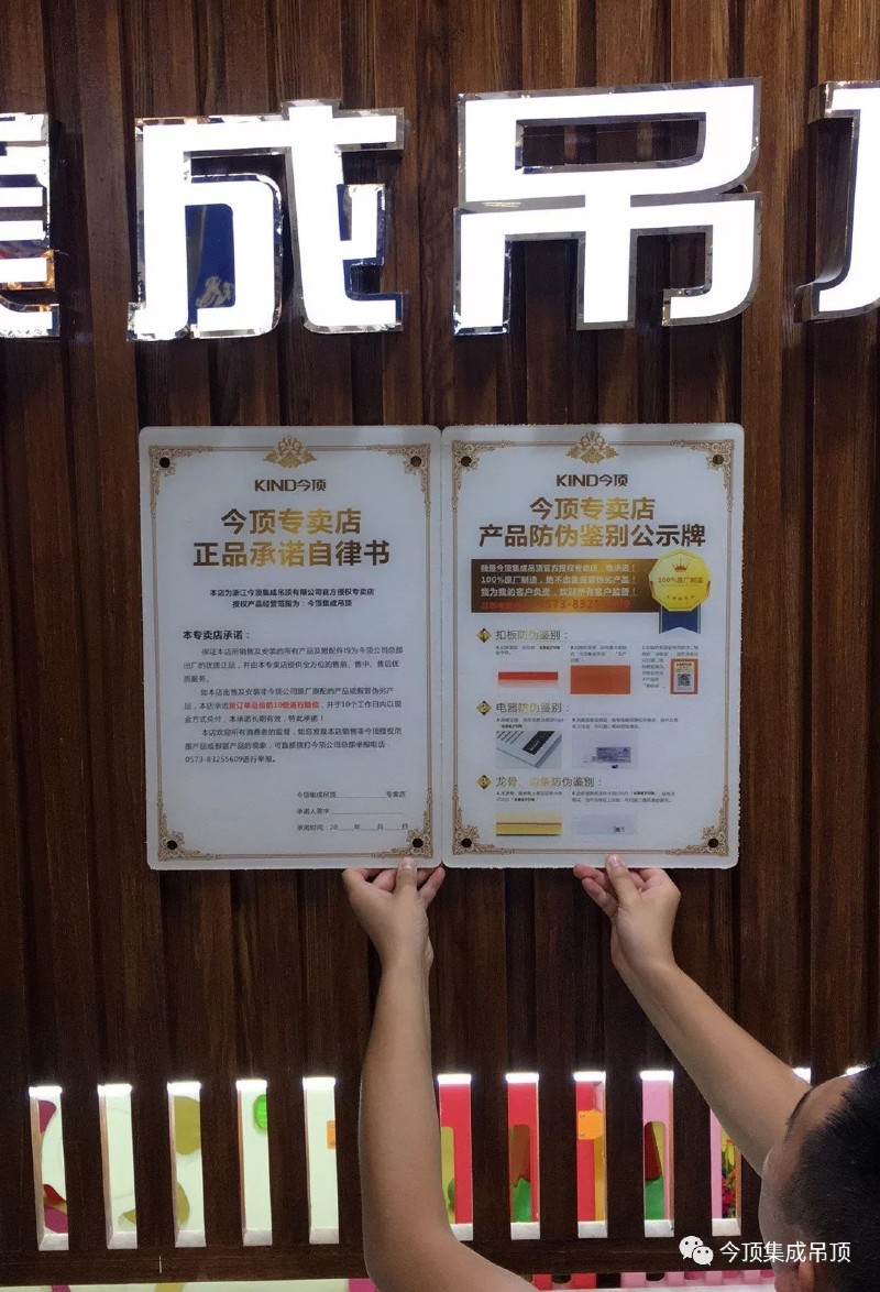 秉承著“金色服務(wù),永不打折”的服務(wù)理念,日前,浙江今頂集成吊頂有限公司向全國(guó)代理商配發(fā)了《正品承諾自律書(shū)》、《今頂正品鑒別公示牌》等物料,要求全國(guó)眾多門店展示于店面醒目之處,做出統(tǒng)一的正品承諾,為消費(fèi)者營(yíng)造放心的購(gòu)物環(huán)境。