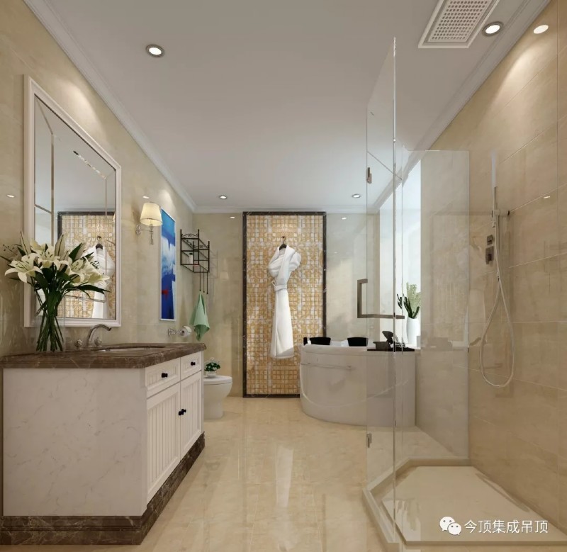 集成吊頂是HUV金屬方板與電器的組合。分扣板模塊、取暖模塊、照明模塊、換氣模塊。具有安裝簡單,布置靈活,維修方便,成為衛(wèi)生間、廚房吊頂?shù)闹髁鳌?/span>