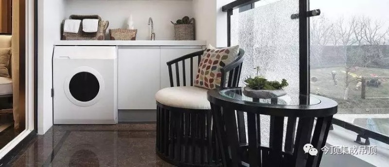 按照家里陽臺大小規(guī)劃洗衣區(qū),承接曬衣服的功能的話,一般需要準備的有洗衣機、晾衣機、手洗盆和工具柜(立柜、吊柜)。
