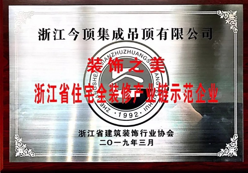 浙江今頂集成吊頂有限公司肩負(fù)行業(yè)重?fù)?dān),積極承擔(dān)社會(huì)責(zé)任,一直秉承讓消費(fèi)者裝修省心、住得安心的信念,再次榮獲“浙江住宅全裝修產(chǎn)業(yè)鏈?zhǔn)痉镀髽I(yè)”榮譽(yù)證書和獎(jiǎng)牌。