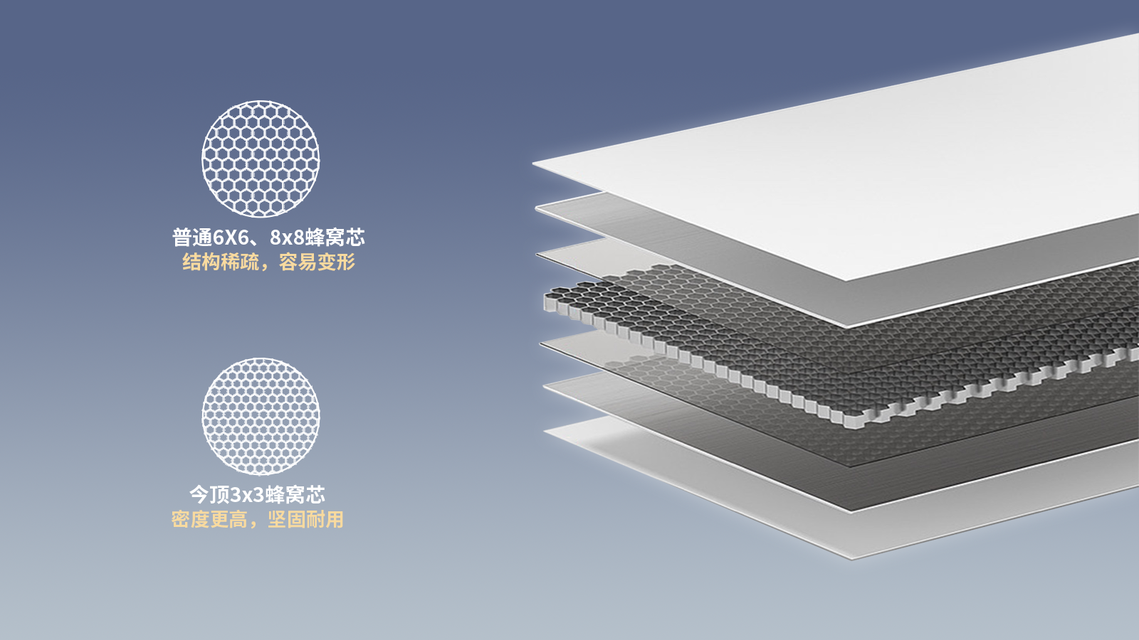 此外,今頂抗油污吊頂還配備了3X3高密度蜂窩芯大板和鋁扣板2種板材選擇,均臻選優(yōu)質(zhì)原生鋁,硬核品質(zhì)保障,天然防潮防霉,耐腐耐蝕,經(jīng)久耐用,滿足不同空間裝修需求。